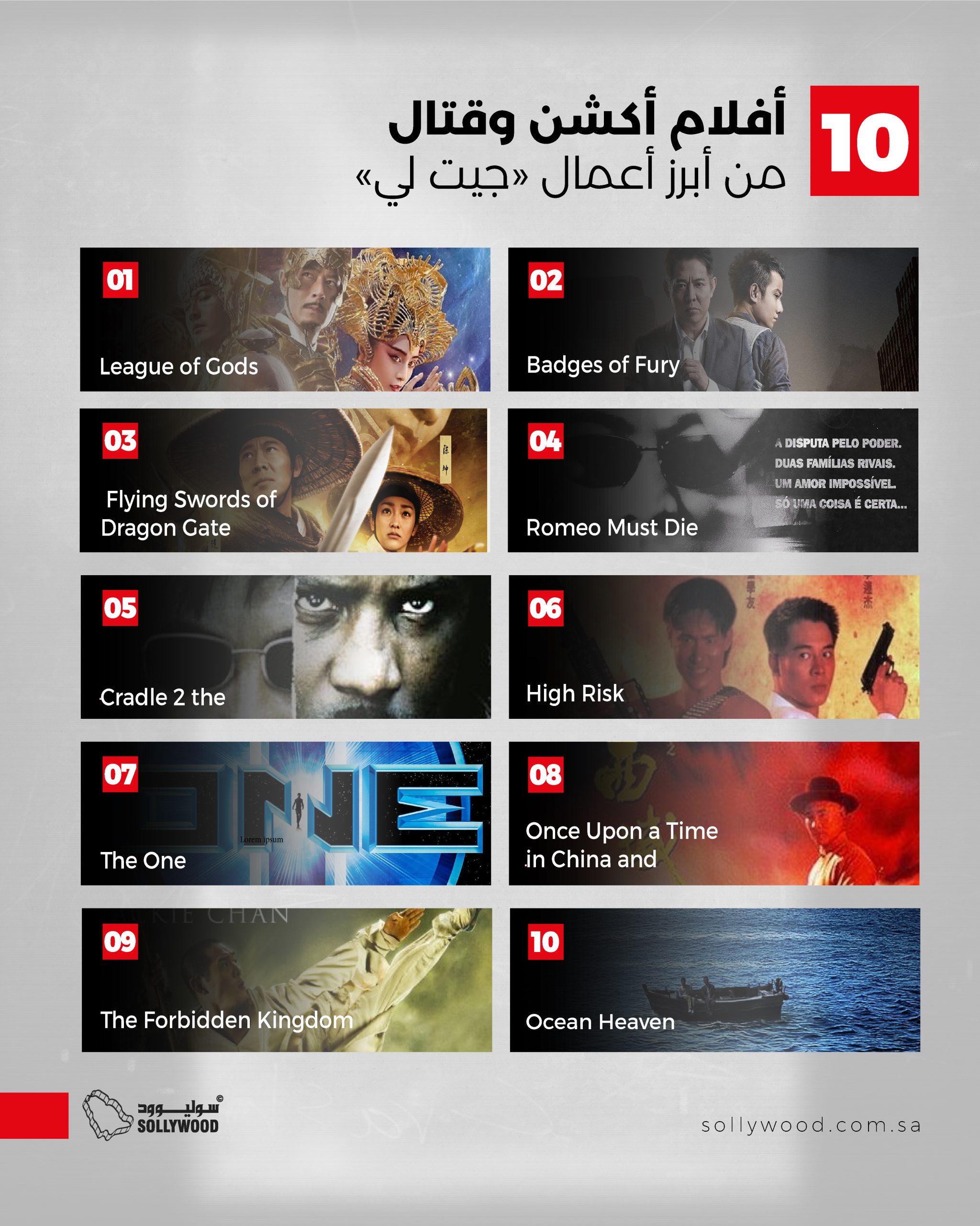 قدم الممثل والمنتج ولاعب الفنون القتالية «جيت لي»، خلال مسيرته المهنية العديد من الأعمال التي حققت شعبية واسعة على مستوى العالم، وتقدمها أفلام الأكشن والقتال التي نالت قبولًا نقديًا وحققت إيرادات مرتفعة؛ إذ برع خلال مسيرته المهنية في تقديم أدور متنوعة منها الشرير والبطل الشعبي الذي يدافع عن الضعفاء، ومحترف الفنون القتالية، وكانت له تجارب جيدة في مجالي الإخراج والإنتاج في السينما. نستعرض خلال السطور التالية قائمة تضم 10 أفلام أكشن وقتال من أبرز أعمال «جيت لي».